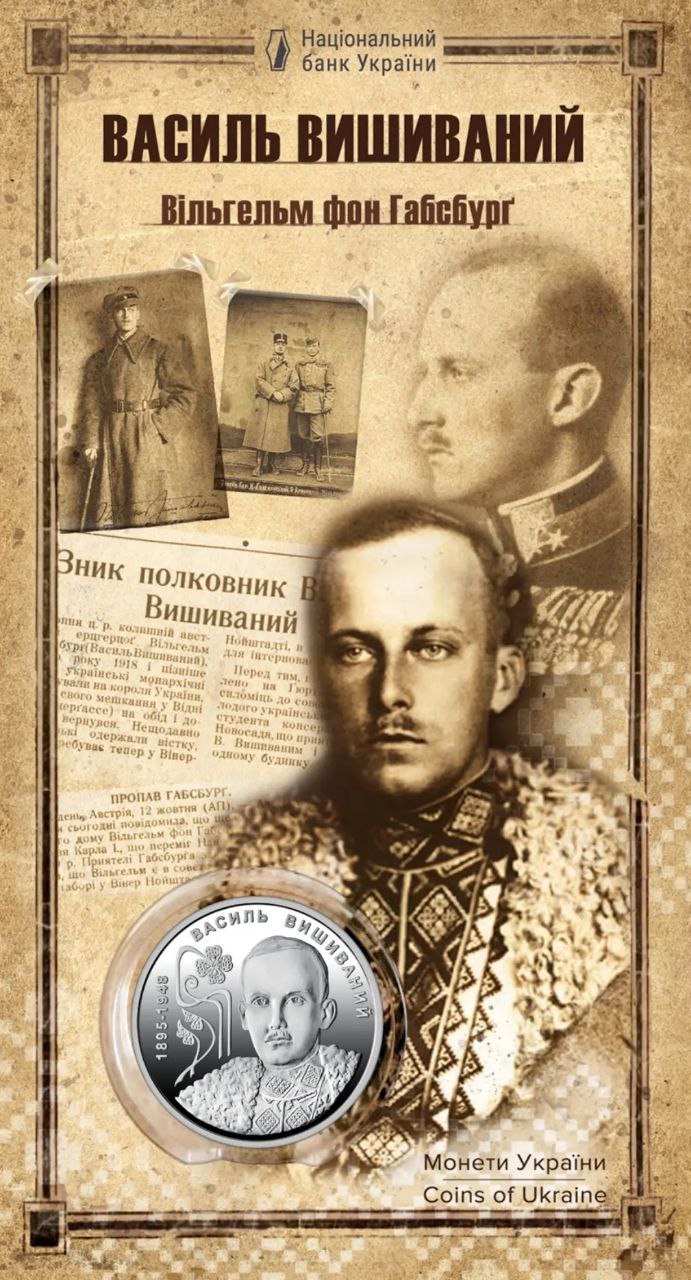 Пам’ятна монета присвячена Вільгельму Францу фон Габсбурґу-Лотрінґену (1895–1948) – представнику європейської аристократії, який увійшов в історію України під псевдонімом Василь Вишиваний. Ерцгерцог австрійський, полковник легіону Українських січових стрільців, поет, дипломат, державний діяч – він був яскравим і непересічним учасником українських визвольних змагань початку ХХ століття. Займаючи визначне місце як на військовому фронті, так і в міжнародних дипломатичних колах, Василь Вишиваний усією своєю діяльністю утверджував ідеали незалежної, соборної України. Завдяки його активній участі Австро-Угорська імперія стала однією з перших країн, що офіційно визнала Українську Народну Республіку.