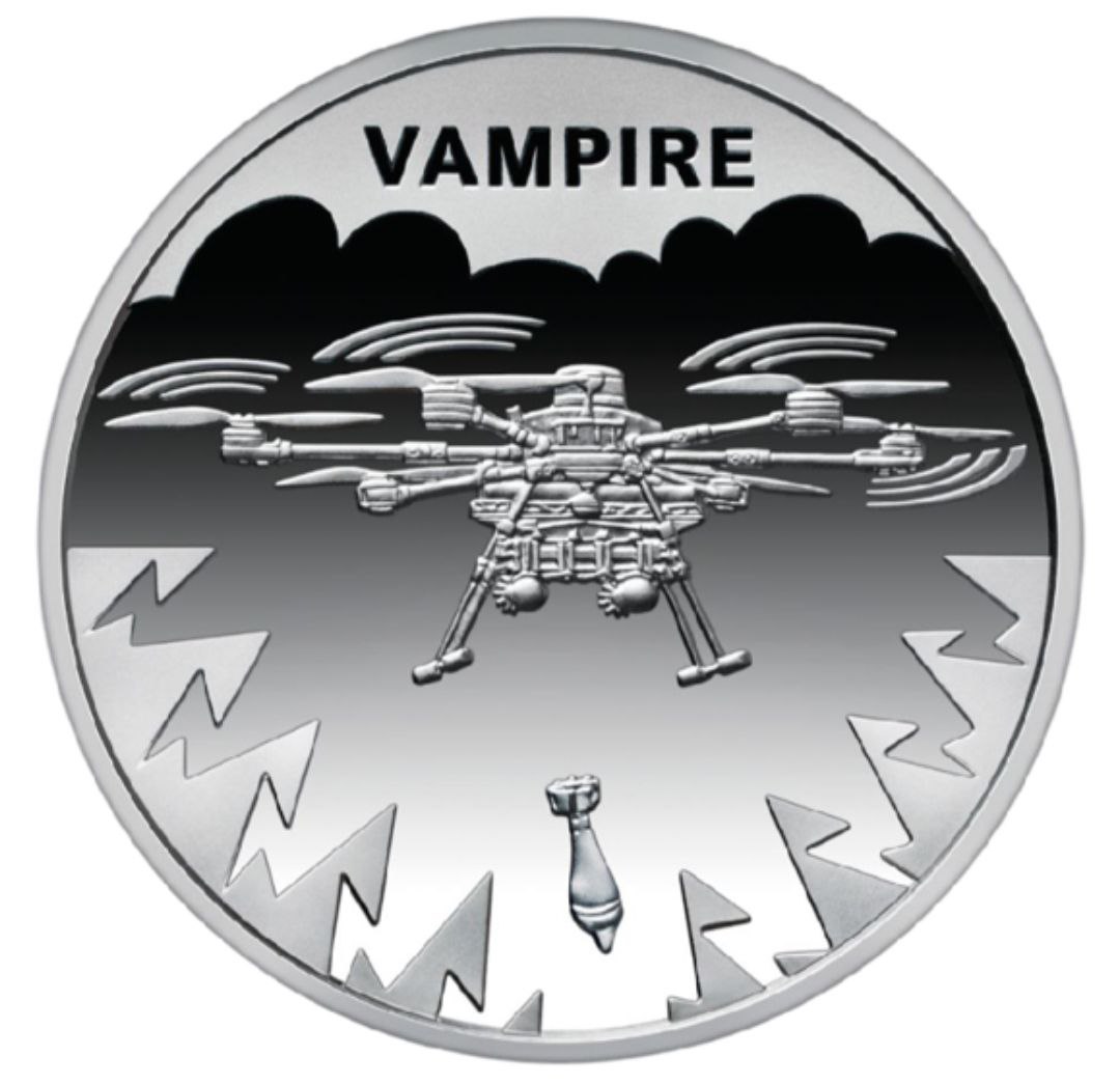 Пам’ятна монета присвячена потужному гексакоптеру “Vampire” – символу технологічної переваги, винахідливості та сили українського спротиву. Розроблений у 2022 році багатоцільовий дрон “Vampire” зарекомендував себе як високоефективний засіб точкового ураження, дистанційного мінування та гуманітарної допомоги. Його активно використовують провідні підрозділи сектору безпеки й оборони України, а понад мільйон проведених операцій засвідчують його ефективність та бойову надійність.