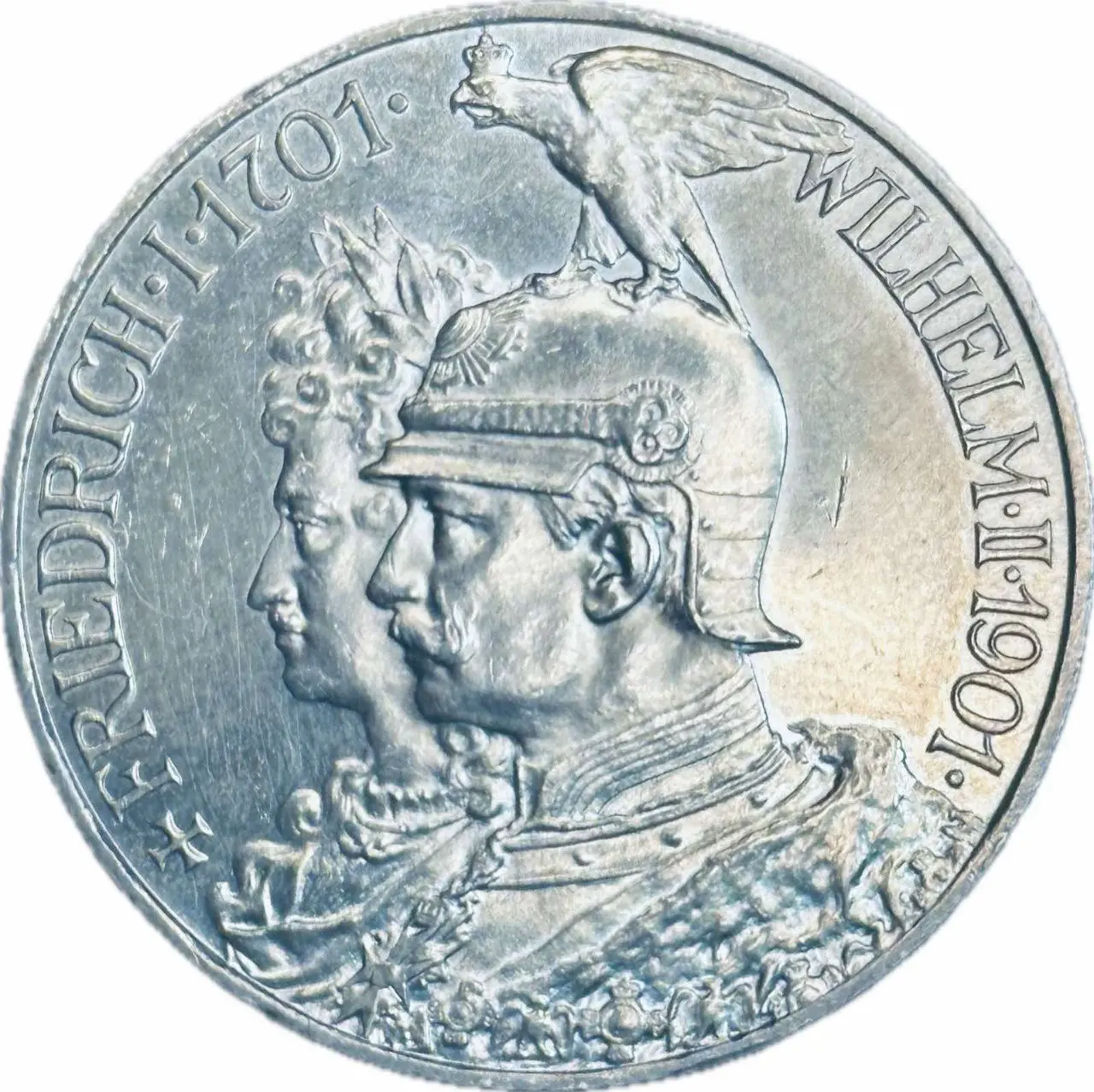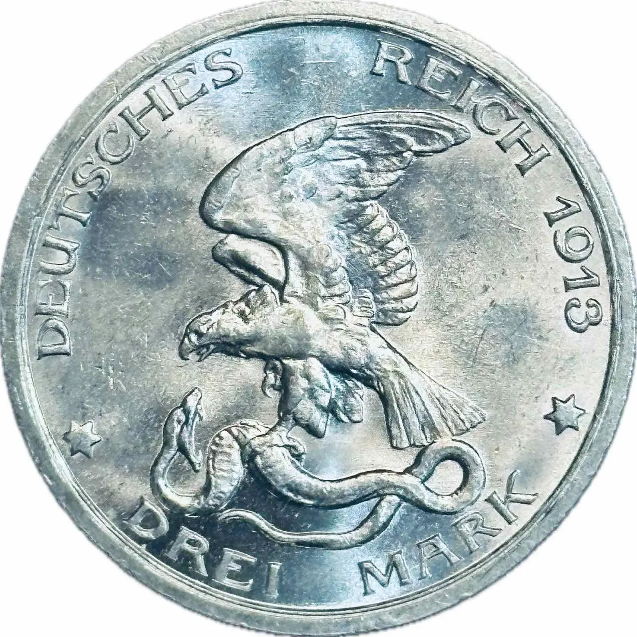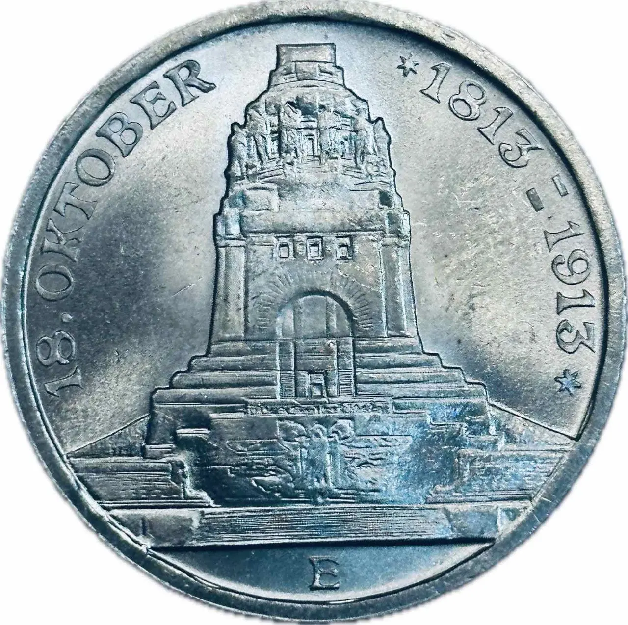 Ця монета номіналом 3 марки 1913 року випущена Німецькою імперією на честь 100-річчя битви під Лейпцигом і присвячена відкриттю монументального Меморіалу народної битви. Вона поєднує історичну значущість із характерною для імперського періоду детальністю виконання, що робить її цінним та бажаним екземпляром у колекціях нумізматів.