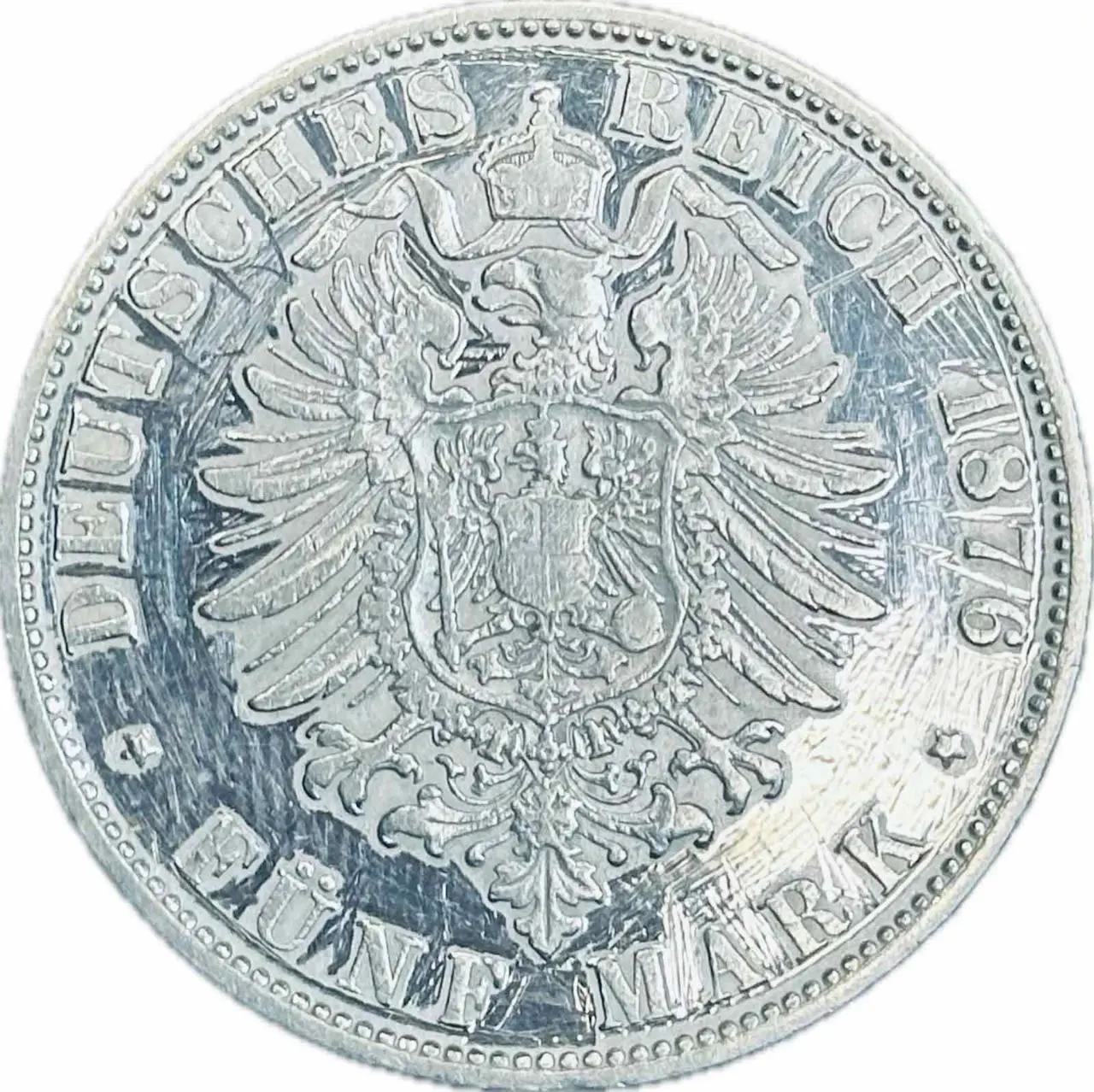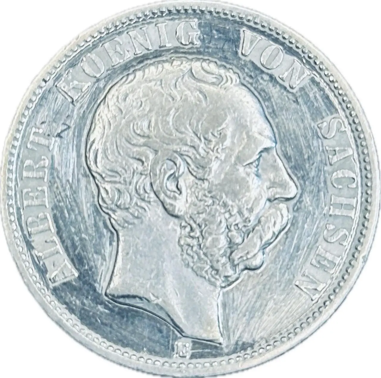 Ця монета номіналом 5 марок 1876 року випущена Німецькою імперією для Королівства Саксонія та присвячена правлінню короля Альберта. Монета є частиною імперської серії та має характерний для того періоду класичний стиль гравіювання, поєднуючи високу якість карбування та історичну цінність для колекціонерів.