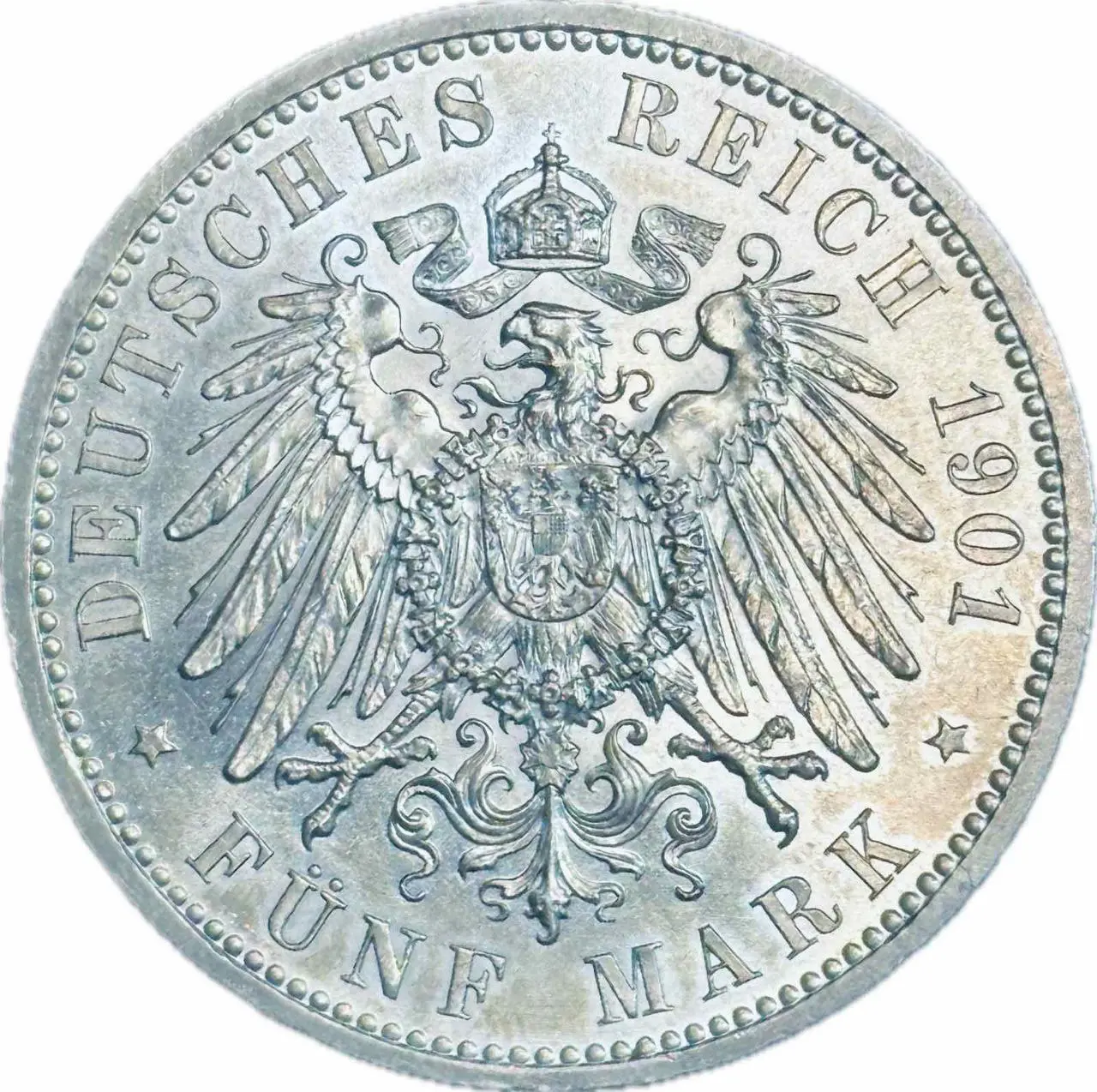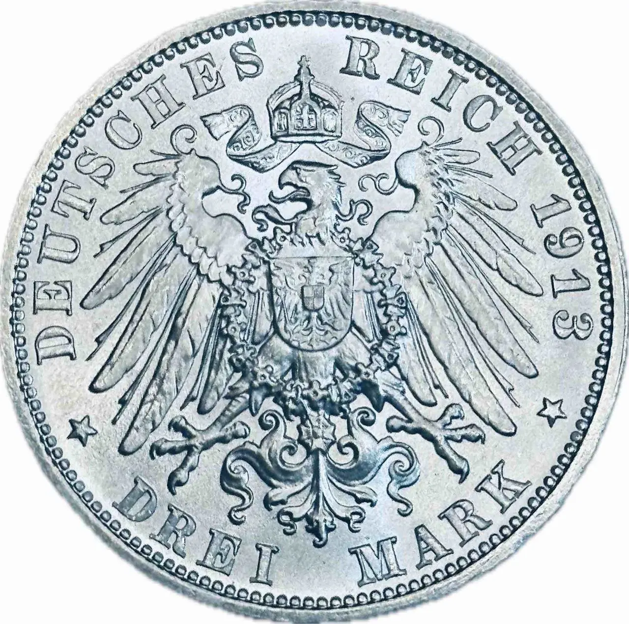 Ця монета номіналом 5 марок 1913 року є пам’ятним зразком грошової системи Німецької імперії та вирізняється високою художньою деталізацією, характерною для монет періоду правління Вільгельма II. Вона поєднує історичну цінність, символіку державної влади та вишукану майстерність граверів, що робить її привабливою для колекціонерів та поціновувачів нумізматики.