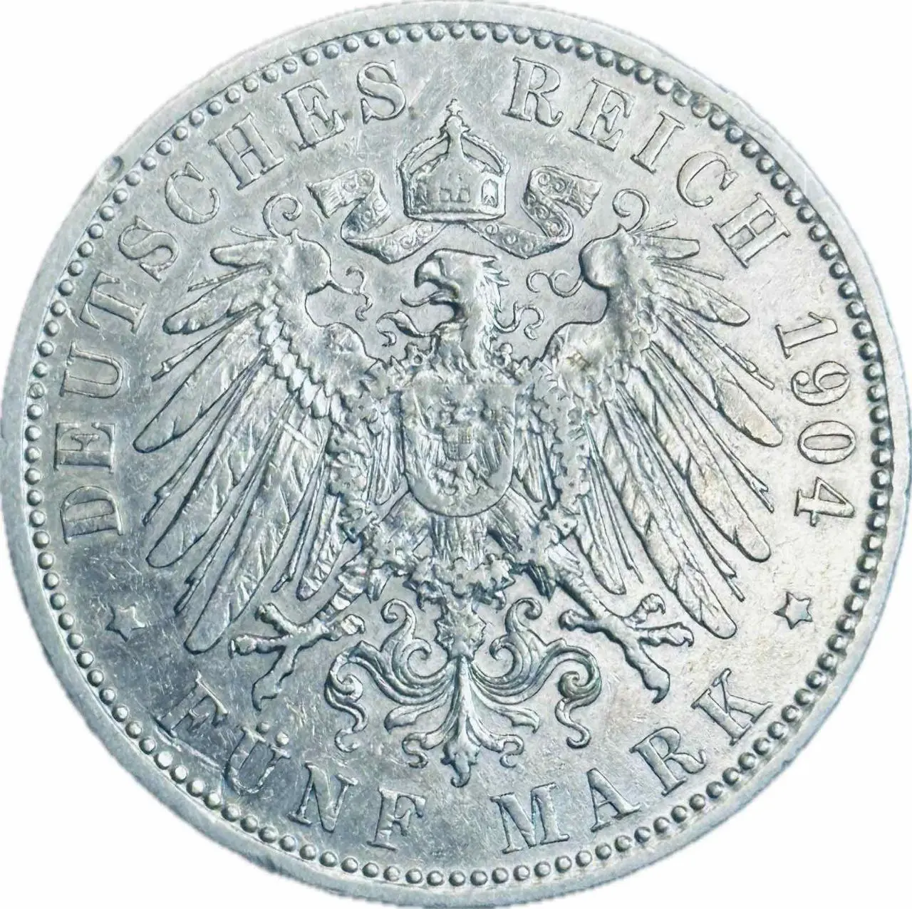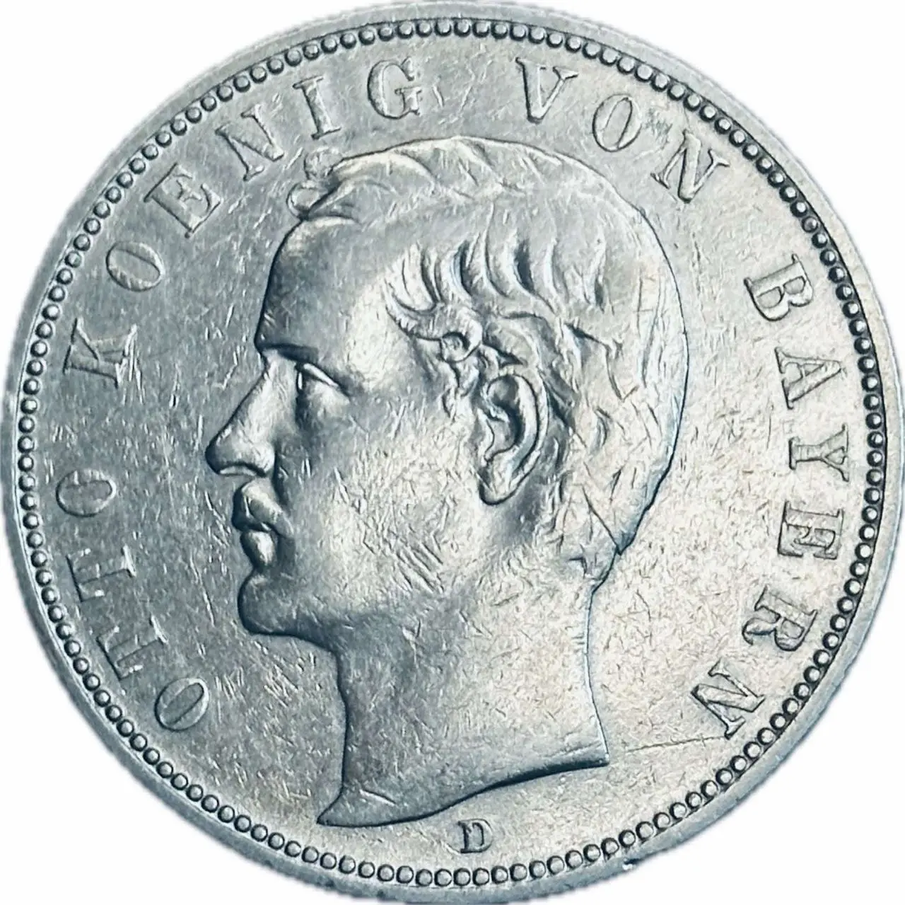 Ця німецька монета номіналом 5 марок 1904 року належить до періоду Німецької імперії та випущена від імені Королівства Баварія. Вона присвячена королю Отто, одному з баварських монархів, і є цінним історичним нумізматичним зразком, що поєднує у собі якість карбування та характерні риси імперської геральдики.