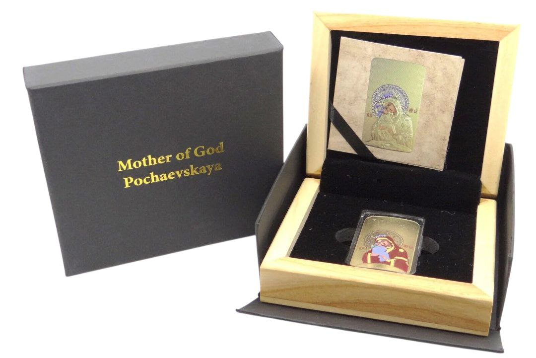 Монета-злиток «Почаївська ікона Божої Матері» (Icon of the Mother of God Pochaevskaya) — це унікальний релігійний пам’ятний срібний злиток вагою 1 тройська унція, випущений обмеженим тиражем приватним монетним двором для колекціонерів та вірян. Виріб відтворює одну з найшанованіших православних святинь — Почаївську ікону Божої Матері, що зберігається в Почаївській Успенській лаврі (Україна).