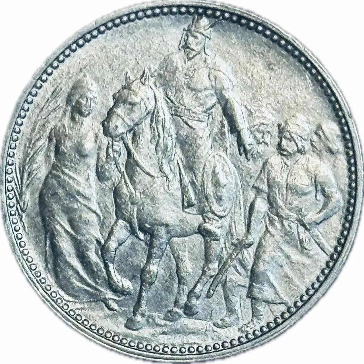 Ця пам’ятна монета номіналом 3 марки 1913 року створена Німецькою імперією на честь 100-річчя визвольних воєн та підняття народного ополчення. Вона поєднує історичну тематику з ефектною рельєфністю композиції, передаючи дух патріотичного піднесення, характерного для подій 1813 року. Монета є цінним зразком імперської нумізматики та відзначається високим художнім рівнем виконання.