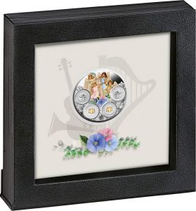 Срібна монета «Маленькі ангели» 2019 року з острова Ніуе є унікальним колекційним випуском, який символізує захист, чистоту та небесну гармонію. Її художній дизайн створено з винятковою увагою до деталей, що робить монету справжнім витвором мистецтва. Вона поєднує кольорове зображення, позолочені елементи та вставки у вигляді маленьких янголів.