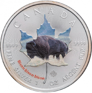 Срібна монета Канади «Кленовий лист – Бізон» 2014 року – це колекційний випуск, який поєднує у собі національний символ країни та силу дикої природи. На ній зображено одного з найвеличніших представників Північної Америки – бізона, що уособлює міць, витривалість та свободу. Монета є частиною серії кольорових випусків Канадського монетного двору, які прикрашають класичний дизайн «Кленового листа».