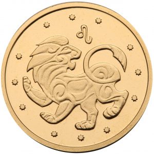 Вишукана золота монета НБУ із серії «Знаки зодіаку». Чисте золото Au 999,9, вага 1,24 г; на реверсі — гордий стилізований лев і знак , на аверсі — символіка чотирьох стихій і сонця. Ідеальний подарунок людям, народженим під знаком Лева, та стильне поповнення колекції українського золота.
