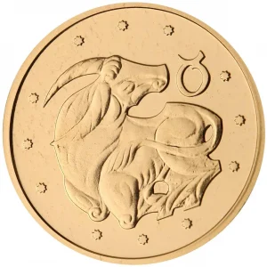 Вишукана золота монета НБУ із серії «Знаки зодіаку». Чисте золото Au 999,9, вага 1,24 г. Ідеальний подарунок для народжених під знаком Тельця та стильне поповнення колекції українського золота.