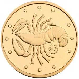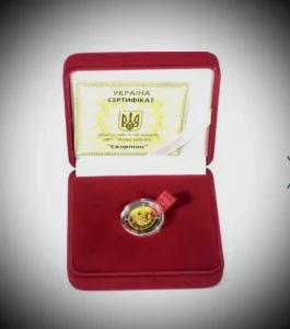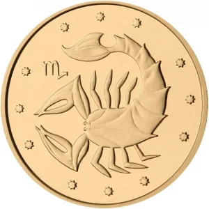 Колекційна золота монета «Скорпіон» з серії «Знаки зодіаку» 1,24 г 2007. Чисте золото Au 999,9, тематичний дизайн зі стилізованим Скорпіоном і символікою чотирьох стихій на аверсі — елегантний подарунок та поповнення колекції українського золота. Скорпіон (23.10–22.11) — знак стихії Води. Йому притаманні сила волі, інтуїція, пристрасність і відданість.