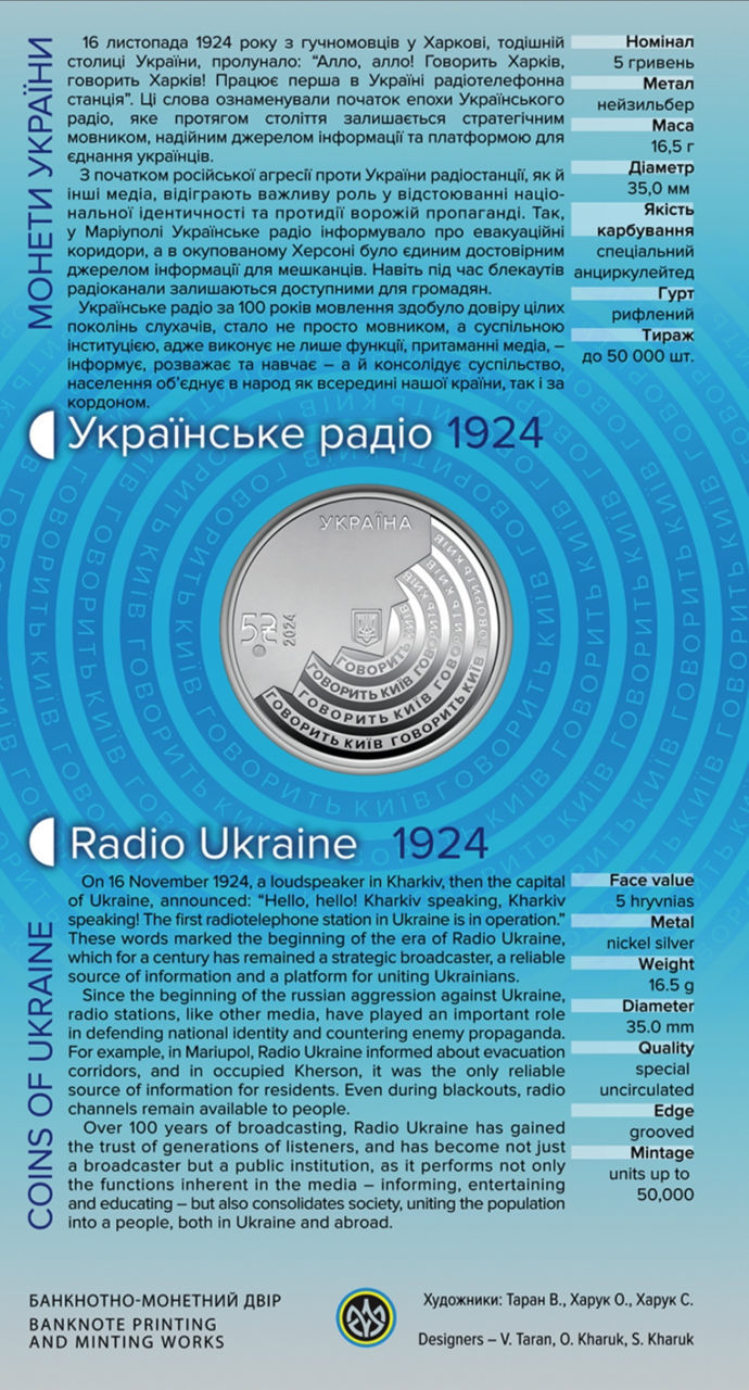 Пам’ятна монета випущена на честь 100-річчя першого українського радіомовника, що розпочав свою діяльність ще у 1924 році та відтоді безперервно виходить в ефір. «Українське Радіо» — найстаріша радіостанція країни, яка відіграє стратегічну роль у медіапросторі й стала потужною платформою для єднання українців. Протягом століття воно здобуло довіру багатьох поколінь слухачів і перетворилося на справжню суспільну інституцію, яка інформує, розважає, навчає та об’єднує громадян як в Україні, так і далеко за її межами.