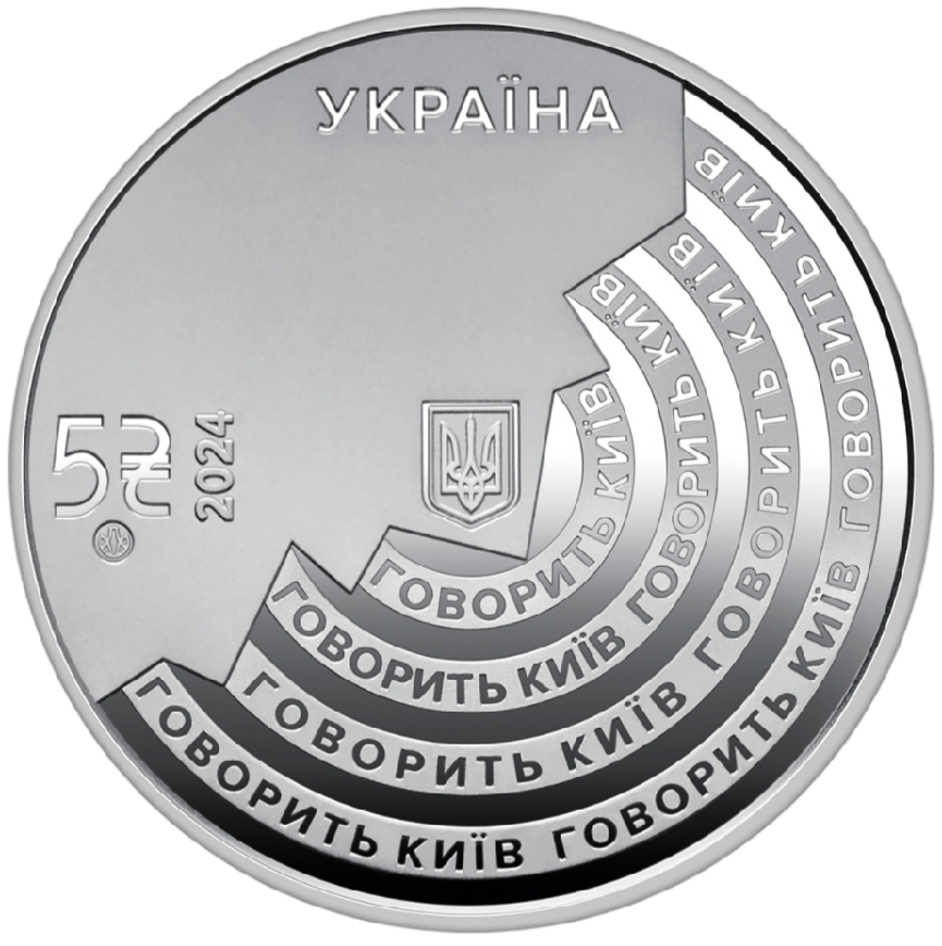 На аверсі монети в центрі композиції розташований малий Державний Герб України, навколо якого багаторазово повторюється фраза “ГОВОРИТЬ КИЇВ”, що акцентує увагу на історичній та сучасній ролі Києва як центру комунікації. Цей елемент також відображає стилізований фрагмент лінії зіткнення й поширення радіохвиль над окупованими територіями, що символізує важливість Українського радіо у відстоюванні національної самобутності та протидії ворожій пропаганді. Угорі зазначено надпис “УКРАЇНА”, ліворуч – номінал 5 з графічним символом гривні (горизонтально), рік карбування – 2024 (вертикально), нижче – логотип Банкнотно-монетного двору Національного банку України.