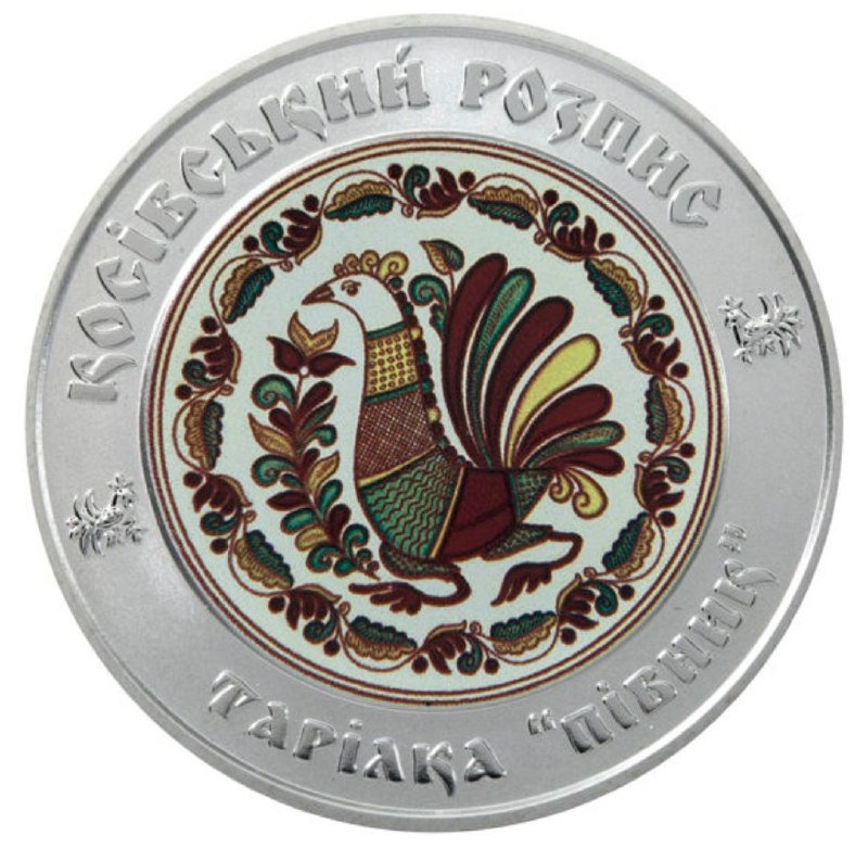На реверсі монети зображено кольорову (використано тамподрук) тарілку із зображенням півня та півколом розміщено написи: КОСІВСЬКИЙ РОЗПИС (угорі), ТАРІЛКА `ПІВНИК` (унизу), праворуч і ліворуч на дзеркальному тлі – стилізовані півники.