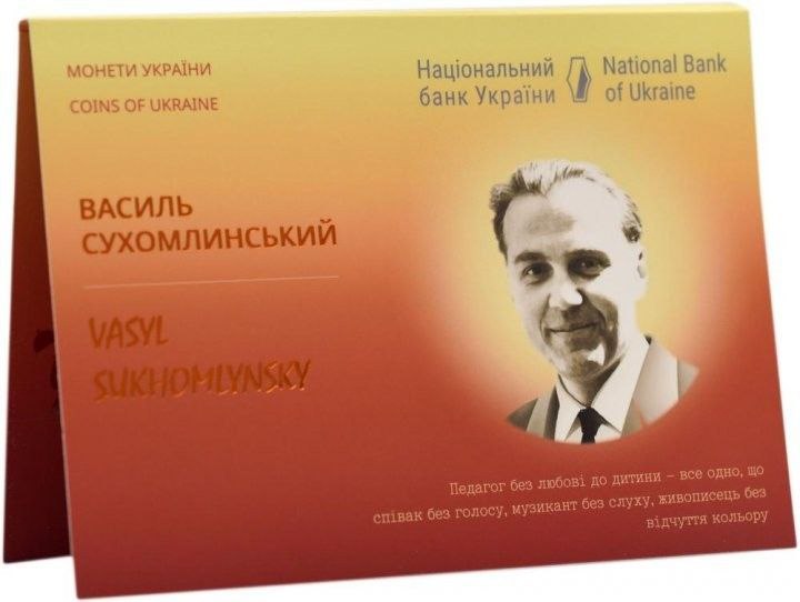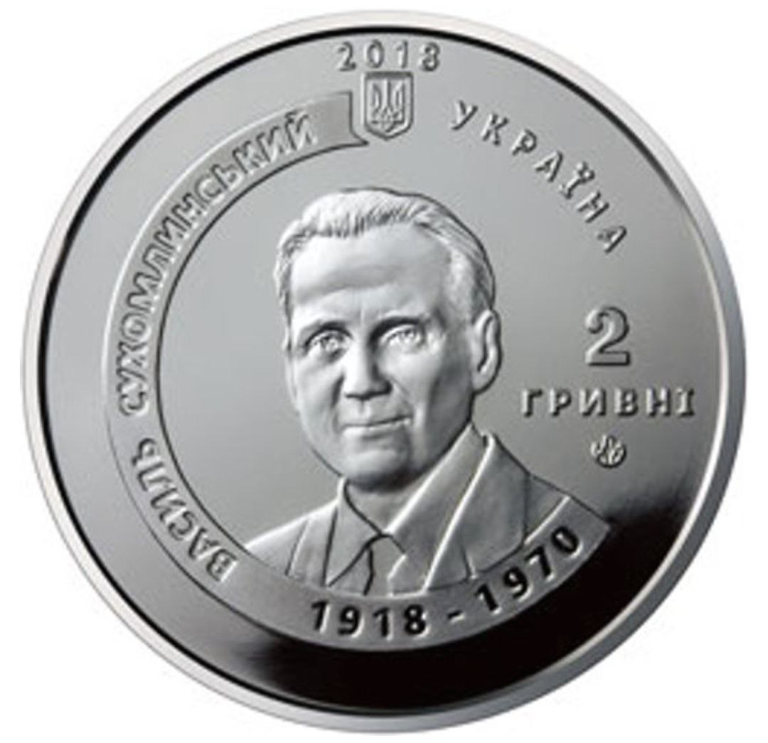 На аверсі монети розміщено: угорі – малий Державний Герб України, праворуч від якого напис УКРАЇНА (півколом), рік карбування монети – 2018 (над гербом); у центрі на дзеркальному тлі – зображено портрет В. О. Сухомлинського, праворуч номінал – 2/ГРИВНІ та логотип Банкнотно-монетного двору Національного банку України; написи півколом на матовому тлі: ВАСИЛЬ СУХОМЛИНСЬКИЙ (ліворуч), 1918 – 1970 (під портретом).