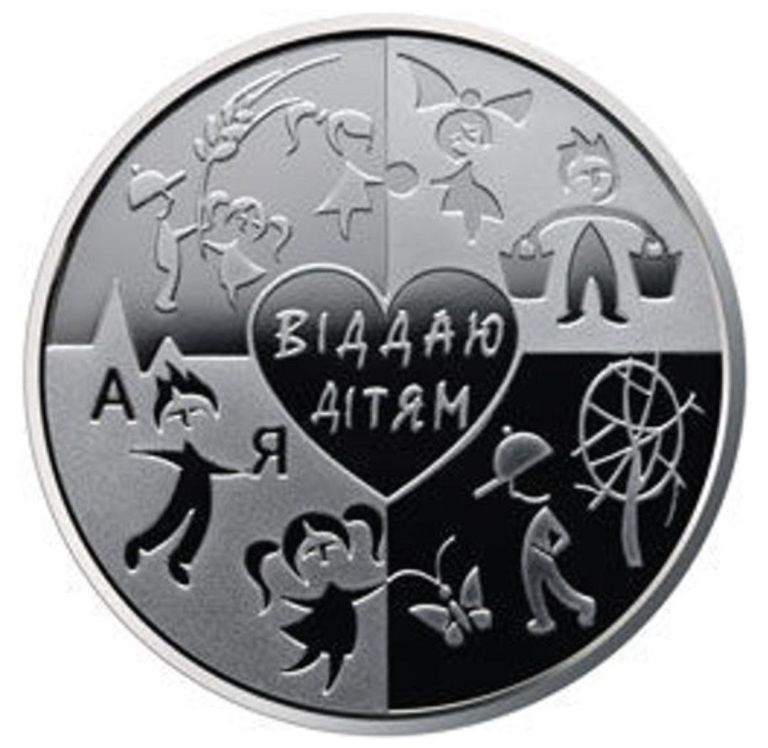 На реверсі монети розміщено серце, у центрі якого напис: ВІДДАЮ ДІТЯМ, навколо серця – стилізовані персонажі з оповідань В. Сухомлинського.