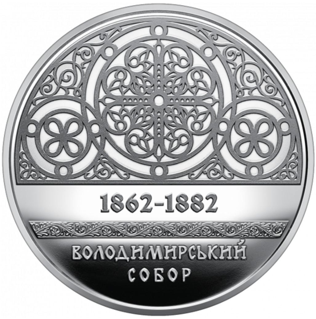 Пам’ятна монета присвячена одній з архітектурних перлин Києва – Володимирському собору. Побудованому у неовізантійському стилі він привертає увагу як своєю історією, так і внутрішнім розписом – справжнім шедевром мистецтва. Більше 10 років продовжувалися роботи над внутрішнім оздобленням храму, унікальні розписи якого і є його основною цінністю.