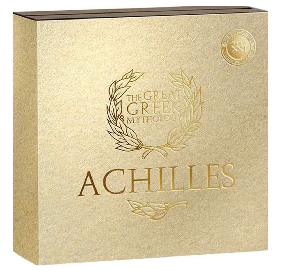 Реверс є справжнім шедевром сучасної нумізматики: у центрі — Ахіллес у коринфському шоломі з високим гребнем, у повному бойовому обладунку зі списом та щитом. Поза динамічна — герой готовий до битви. Наконечник списа покритий чистим золотом. На другому плані детально зображені сцени Троянської війни: колісниці, воїни, коні. У верхній частині великими літерами викарбувано «ACHILLES», по краю — традиційний грецький меандр.