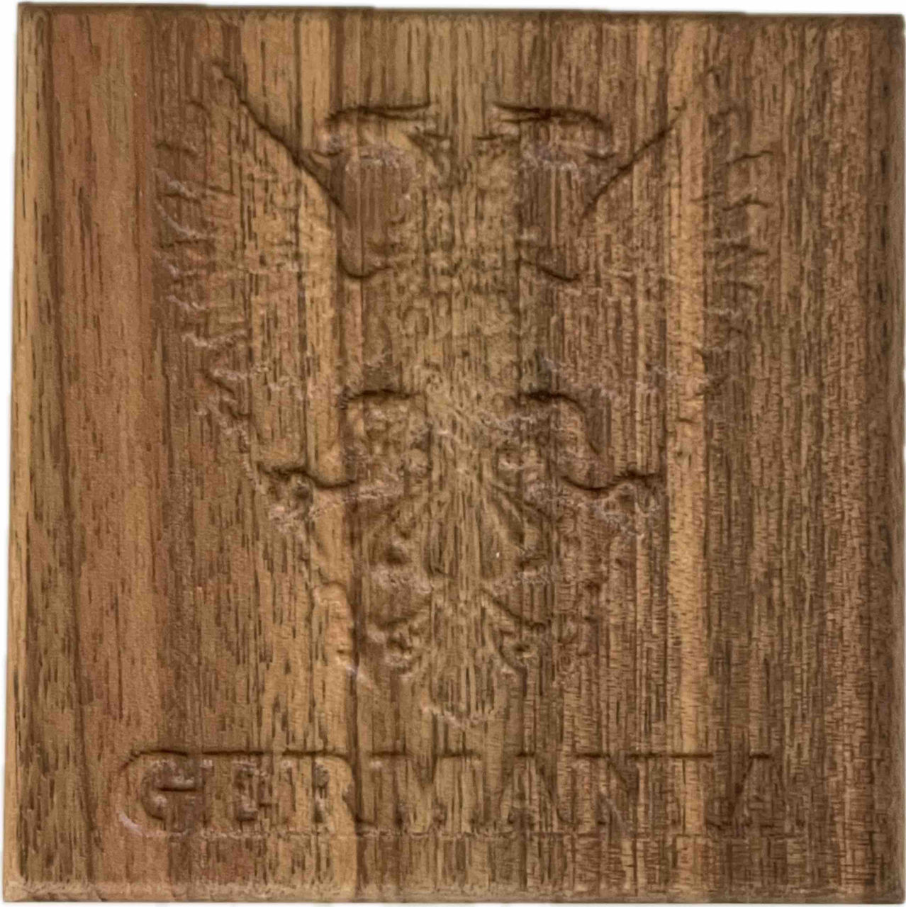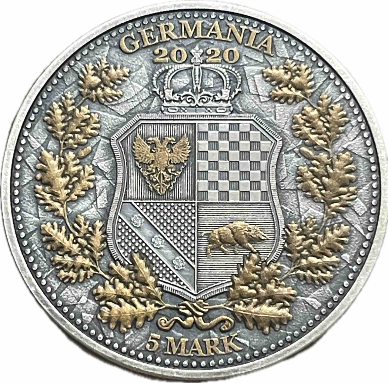 Реверс монети прикрашений гербом Германії, поділеним на чотири частини: з орлом, щитом, смугастим полем та зображенням дикого кабана. Навколо розміщені гілки дубового листя, а над гербом — корона, символ монархічної величі. Угорі викарбувано напис GERMANIA 2020, а внизу — номінал 5 MARK.