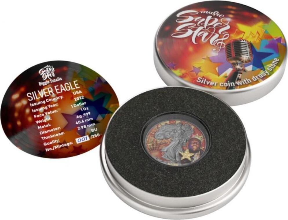 На аверсі зображено традиційний образ «Walking Liberty», що символізує свободу та надію. На тлі яскравих червоно-золотих відтінків видно портрет The Notorious B.I.G. у знаменитій короні — символі його статусу «Короля Нью-Йорка». Позаду розташовані зображення доларових банкнот, що символізують славу, успіх і матеріальні спокуси, якими супроводжувалося життя артиста. Написи «LIBERTY», «IN GOD WE TRUST» і рік «2022» зберігають класичну структуру дизайну. Особливого блиску додає декоративна золота зірка в нижній частині, яка підкреслює велич та вплив Біджі на музичну культуру.