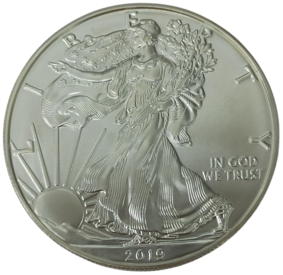 На аверсі зображено постать Леді Ліберті, що крокує вперед із гілкою лавра і смолоскипом у руках, символізуючи процвітання, свободу та надію. На задньому плані видно схід сонця, який підкреслює новий початок і силу нації. По колу розміщено напис LIBERTY, а також девіз «IN GOD WE TRUST» і рік карбування — 2019.