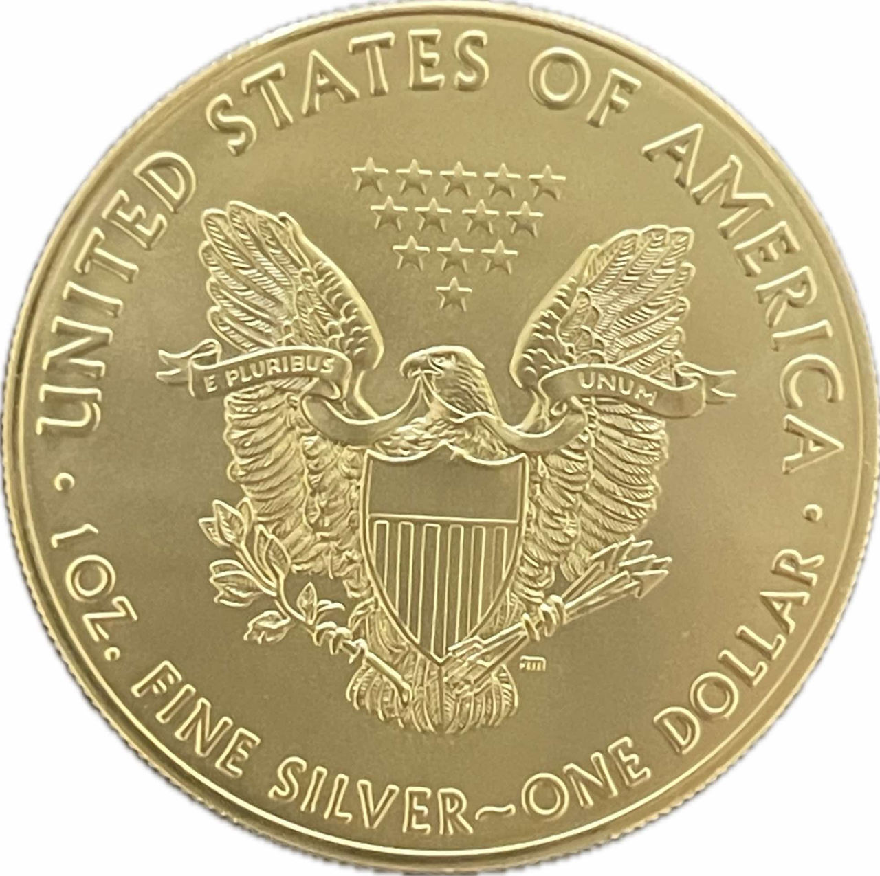 Реверс демонструє класичний герб США – орла з розправленими крилами, що тримає у лапах оливкову гілку та стріли. Над ним зображено 13 зірок, які символізують перші штати Сполучених Штатів Америки. Навколо розташовані написи “United States of America”, “One Dollar” та позначення ваги і металу – “1 oz. Fine Silver”.