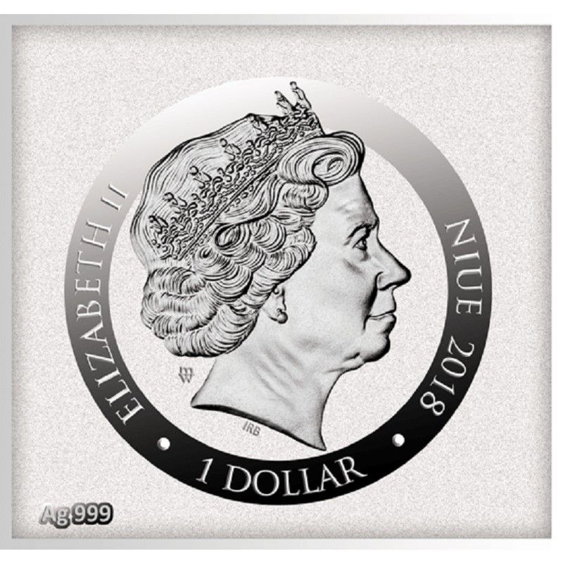 Аверс монети прикрашений традиційним портретом Її Величності Королеви Єлизавети II роботи Іана Ренка-Бродлі. Навколо зображення розташовані написи «ELIZABETH II», «NIUE 2018», «1 DOLLAR» і позначення металу «Ag 999». Дзеркальне поле підкреслює шляхетний блиск срібла, створюючи ідеальний контраст із рельєфним профілем монарха.
