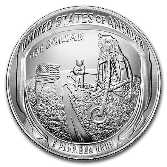 Реверс монети демонструє відображення у шоломі астронавта: на передньому плані видно іншого астронавта, американський прапор і місячний модуль. Ця деталь створює відчуття присутності, нагадуючи про момент, коли людська нога вперше торкнулася іншого небесного тіла.