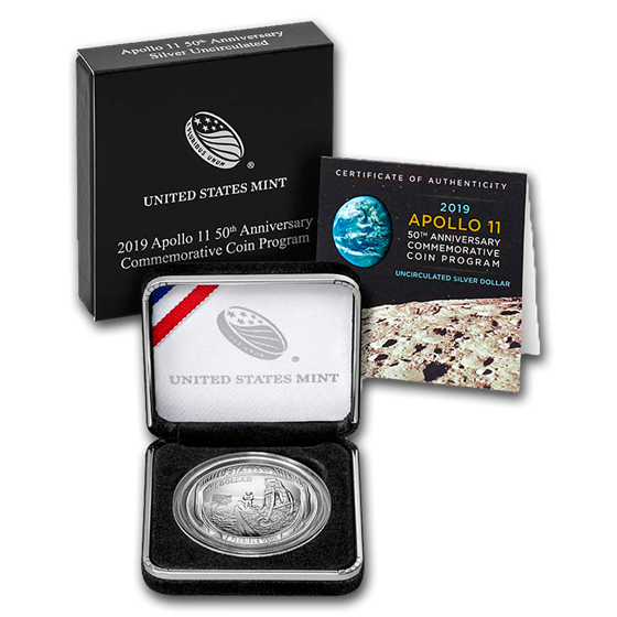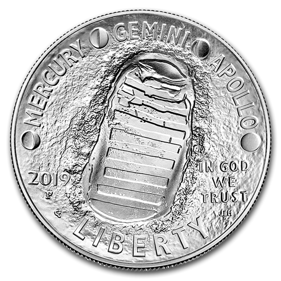 На аверсі зображено відбиток черевика астронавта на поверхні Місяця – один із найвідоміших символів місії «Аполлон-11». Навколо нього розміщені написи «MERCURY», «GEMINI», «APOLLO», що символізують основні етапи американської космічної програми, а також «LIBERTY», «IN GOD WE TRUST» і рік випуску – 2019.