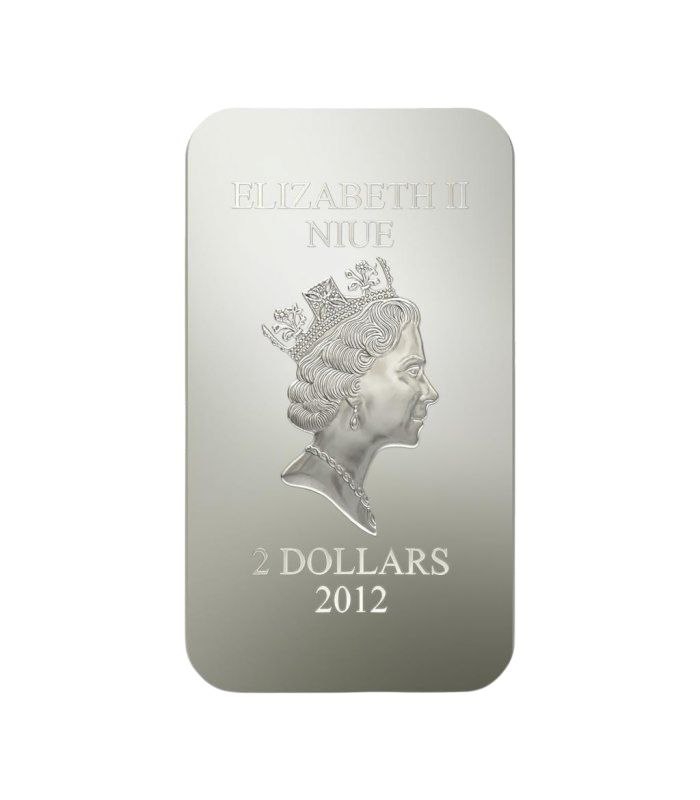 На аверсі монети зображено портрет Її Величності королеви Єлизавети II. Над портретом розташовані написи «ELIZABETH II» та «NIUE», під ним — номінал «2 DOLLARS» і рік випуску «2012». Ця частина монети має дзеркальне тло, що контрастує з матовим рельєфом, створюючи відчуття монетної гармонії й строгості.