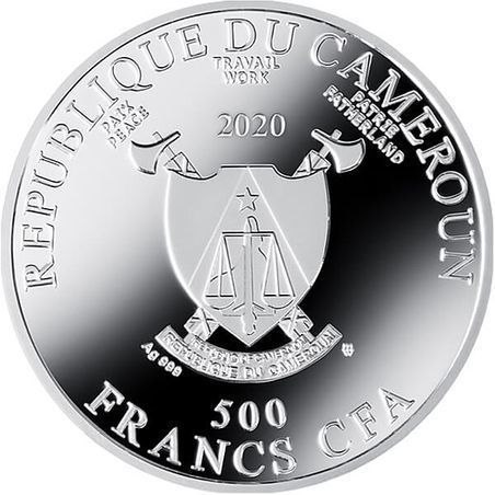 Аверс монети прикрашений гербом Республіки Камерун, довкола якого розміщені написи французькою та англійською мовами: «REPUBLIQUE DU CAMEROUN», «PAIX – TRAVAIL – PATRIE» («Мир – Праця – Вітчизна»). У центрі зображено щит із вагами правосуддя, над яким — зірка, а під ним — стрічка з назвою держави. Внизу вказані проба срібла Ag 999, рік випуску 2020 і номінал 500 франків CFA.