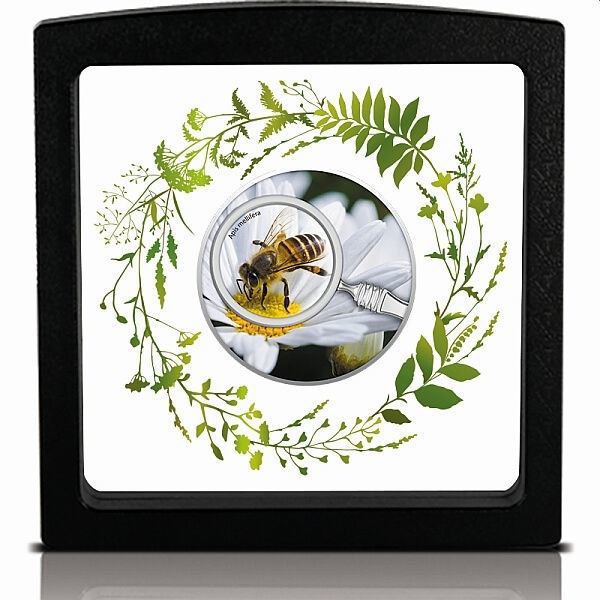 Реверс монети виконаний у яскравому кольоровому дизайні. На ньому зображено медоносну бджолу (Apis mellifera), яка збирає нектар із білої ромашки. Над комахою вказано її латинську назву. Особливістю дизайну є прозорий куполоподібний елемент, що імітує збільшувальне скло, створюючи ефект 3D та ніби «наближаючи» бджолу до спостерігача. Кожна деталь — від структури крил до крапель пилку — промальована з ювелірною точністю.