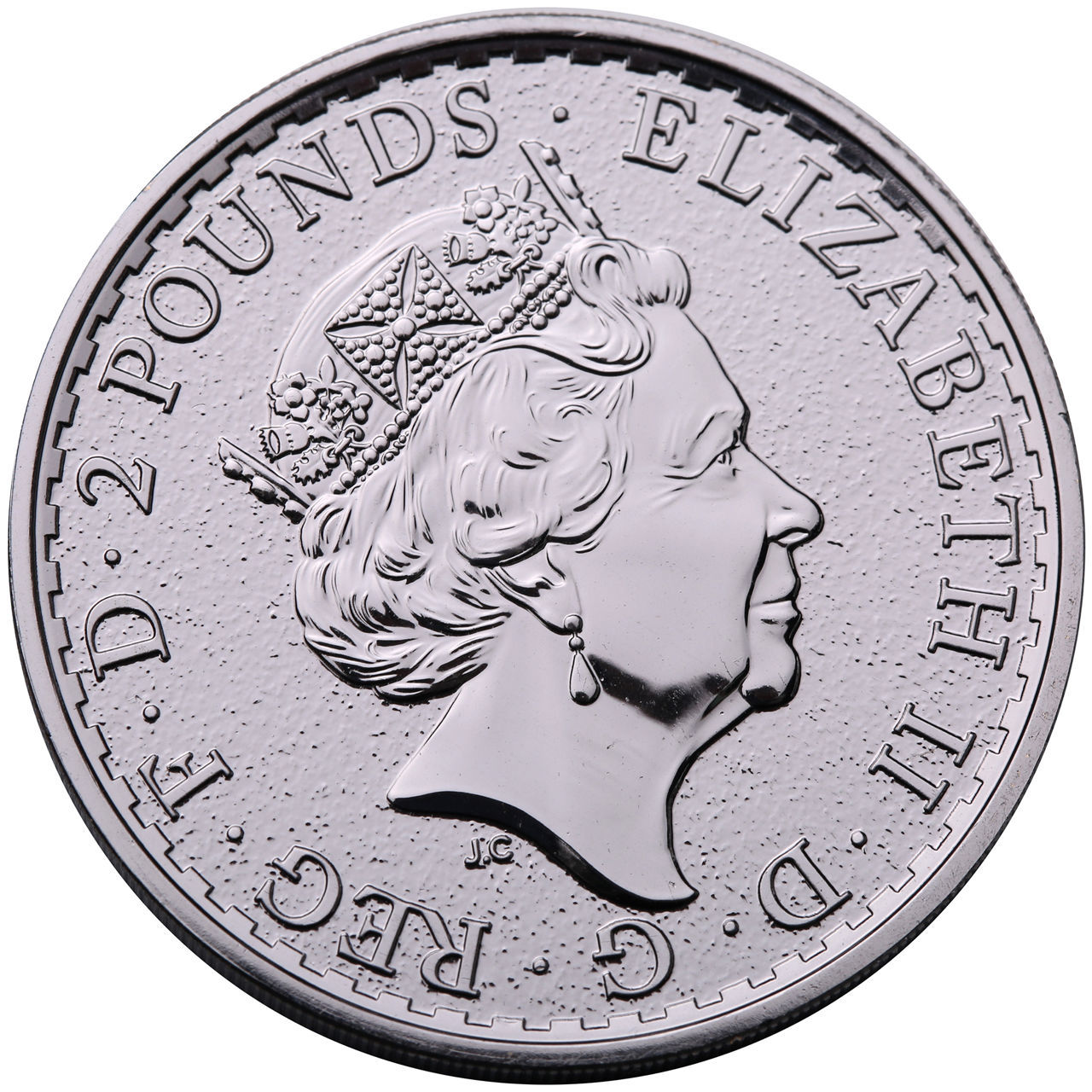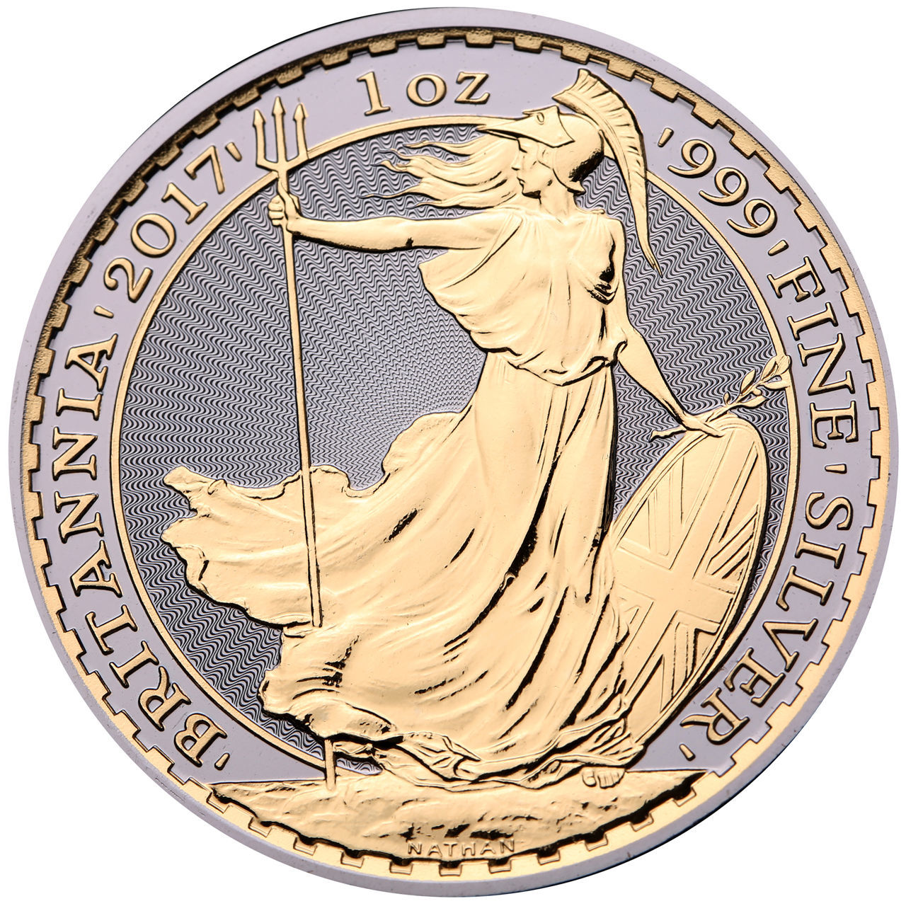 Реверс монети присвячений Британії — алегоричному образу жіночої сили, яка стоїть із тризубцем у руці, символізуючи морську могутність держави. Вона тримає щит із прапором Сполученого Королівства, а її образ виконано з позолотою, що контрастує з темним фоном. Навколо зображення вказано рік випуску, вагу монети, пробу срібла (.999) та напис “BRITANNIA”.