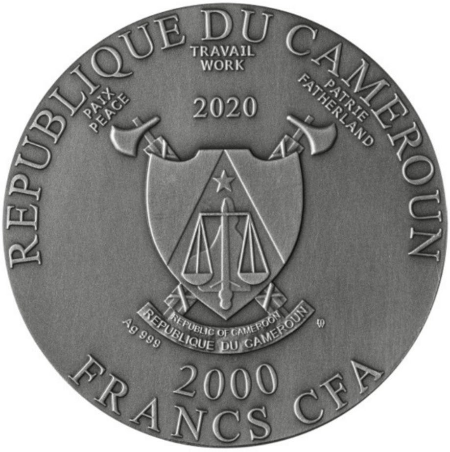 Аверс монети містить державний герб Республіки Камерун — країни-емітента. Навколо розташовані написи «REPUBLIQUE DU CAMEROUN», «PAIX – TRAVAIL – PATRIE» (Мир – Праця – Вітчизна), рік випуску 2020, номінал 2000 франків CFA і проба срібла Ag 999. Вишукане матове оздоблення підкреслює велич офіційної символіки.