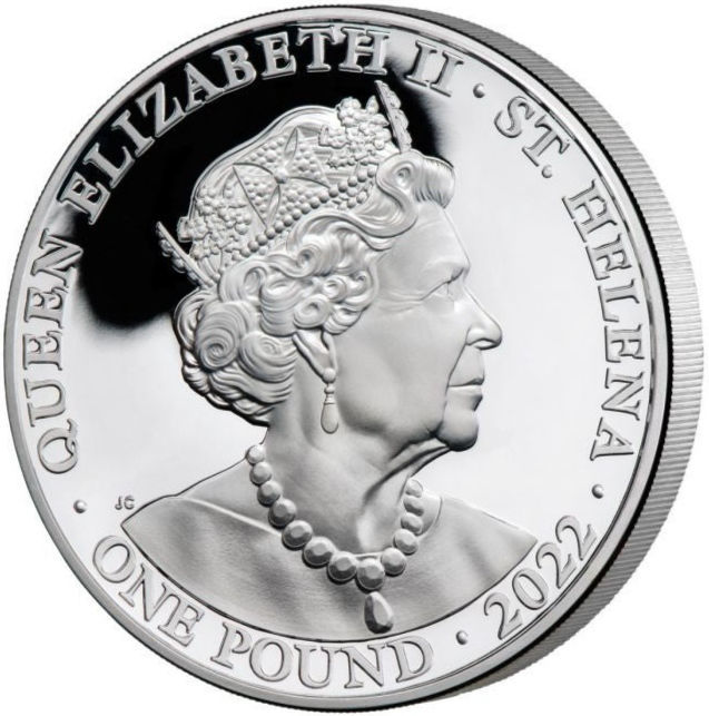 На аверсі монети зображено портрет королеви Єлизавети II, роботи художника Джоді Кларка. Навколо портрета розміщено написи “QUEEN ELIZABETH II”, “ST. HELENA”, “ONE POUND” та рік випуску “2022”. Дизайн підкреслює монархічну велич і спадковість британської династії, традиційно представлену у профільному вигляді.