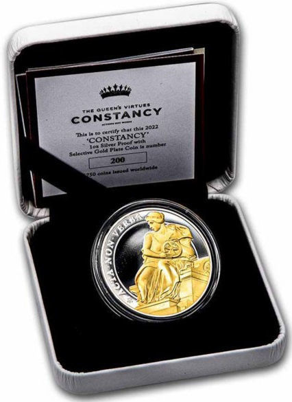 Срібна монета «Acta Non Verba – Virtues of the Queen» випущена у 2022 році та символізує девіз «Справи, а не слова». Вона присвячена одній із семи добродійних чеснот королеви, уособлюючи мудрість, гідність і служіння народу. Ця монета є частиною серії, яка відображає моральні якості монарха, що стали прикладом для багатьох поколінь. Її вишукане поєднання срібла та позолоти створює ефект урочистості та благородства.