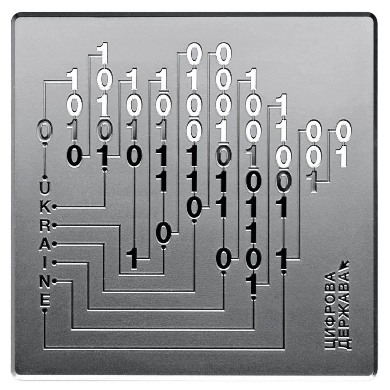 На реверсі монети зображена схематична карта України, створена з цифр двійкового коду. Цей код не є випадковим – у ньому зашифрована назва UKRAINE (ліворуч вертикально), яку можна розшифрувати, простеживши шлях від кожної окремої літери до відповідної послідовності цифр. Унизу праворуч зазначено напис ЦИФРОВА ДЕРЖАВА, на який наведено стрілочку (курсор “мишки”). Композиція символізує основу цифрового світу, підкреслюючи важливість технологій для розвитку країни.
