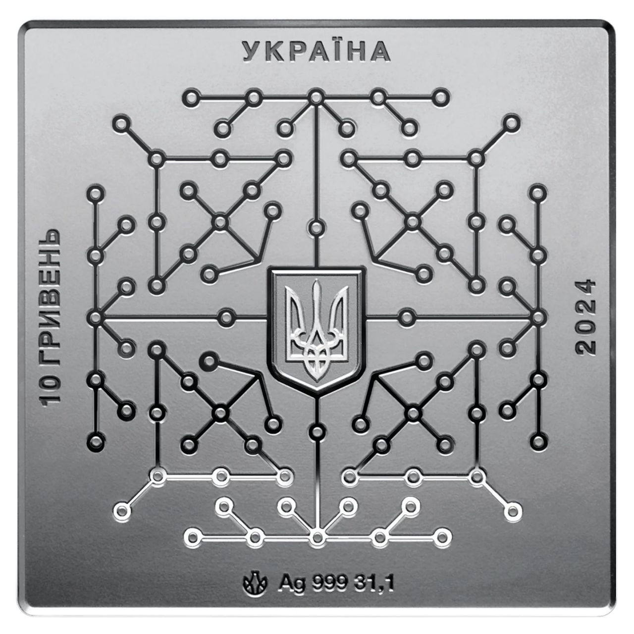 На аверсі монети в центрі композиції розміщено малий Державний Герб України, оточений електронною схемою / мережею. Ця комбінація символізує Україну як єдину цифрову систему, монолітну та цілісну державу, яка за допомогою новітніх технологій об’єднала всі аспекти життя своїх громадян. У цій мережі можна побачити символічне об’єднання заходу, сходу, півдня та півночі під єдиним гербом, що підкреслює єдність країни. Угорі над схемою – напис УКРАЇНА, ліворуч – номінал 10 та напис ГРИВЕНЬ; праворуч – рік карбування монети 2024, унизу – логотип Банкнотно-монетного двору Національного банку України, маса монети в чистоті 31,1 та позначення металу і проби Ag 999.