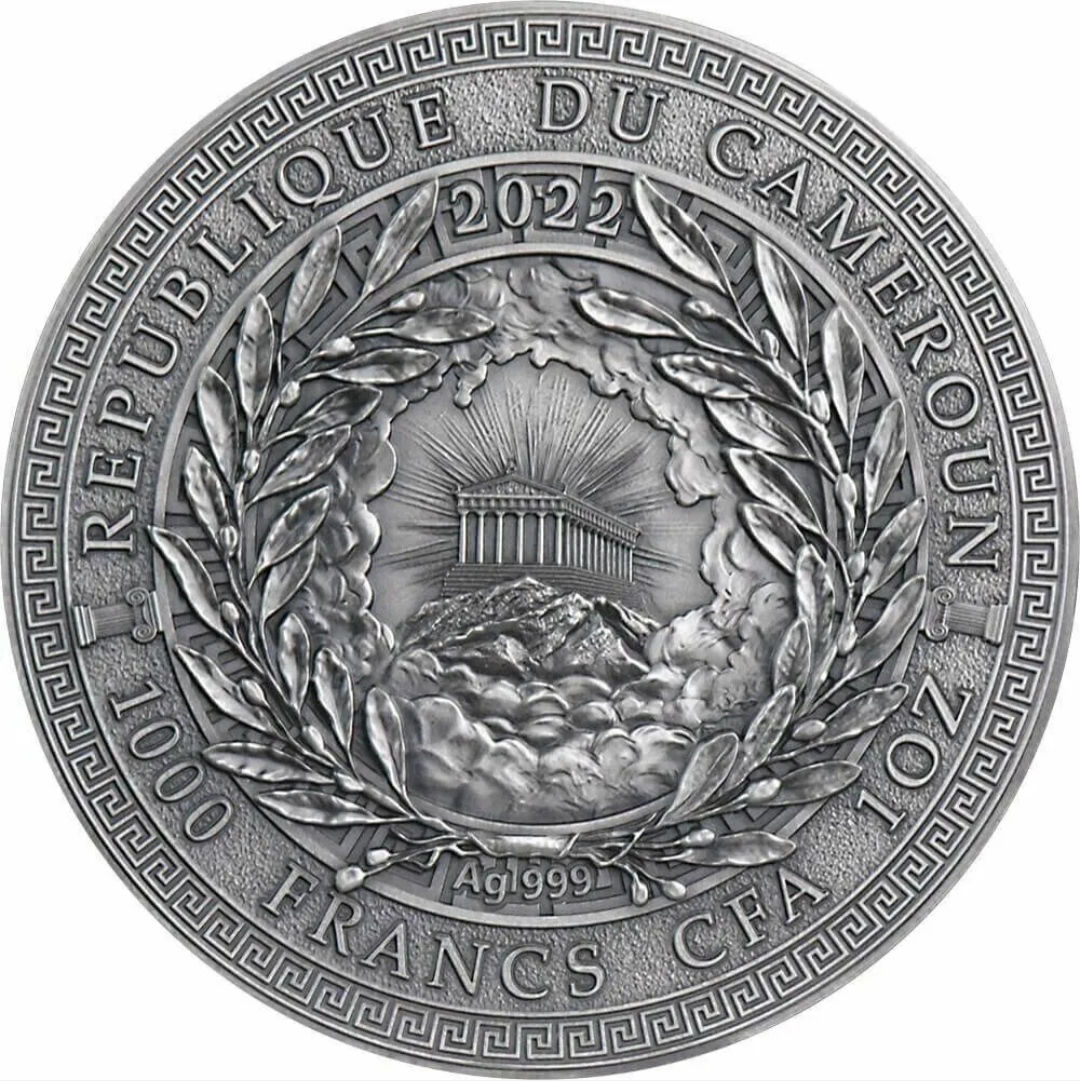 Реверс монети прикрашений гербом Республіки Камерун, оскільки саме ця країна виступає офіційним емітентом випуску. У центрі зображено давньогрецький храм, що здіймається над хмарами, оточений вінком із лаврового листя — символом слави й безсмертя. Угорі розташований рік випуску 2022, унизу — номінал 1000 франків CFA і позначення металу Ag 999.