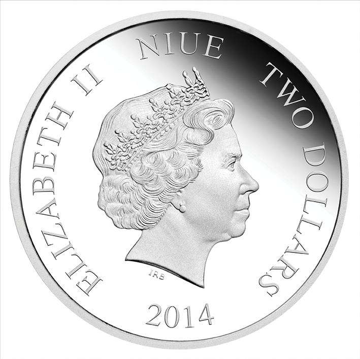 На аверсі монети традиційно розміщено портрет Її Величності королеви Єлизавети II. Навколо портрета викарбувані написи «ELIZABETH II», «NIUE», «TWO DOLLARS» і рік випуску — «2014». Дзеркальне тло підкреслює офіційний статус монети як законного платіжного засобу та надає їй вишуканого блиску.
