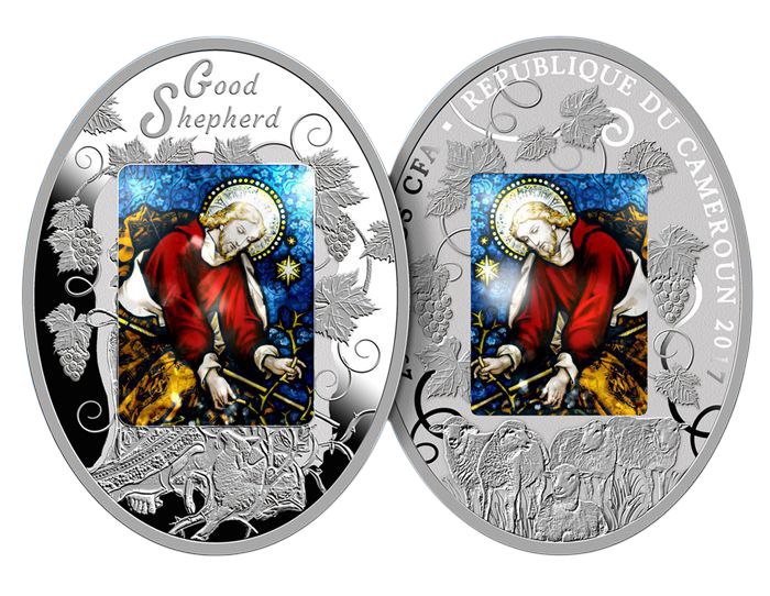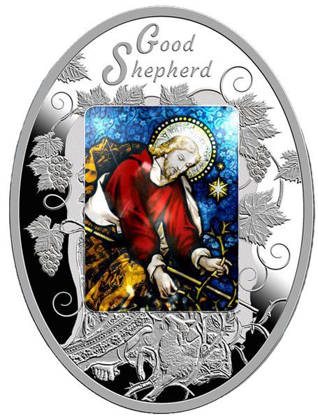 Реверс вражає кольоровим зображенням Христа як Доброго Пастиря, натхненним вітражними вікнами стародавніх соборів. Яскраві відтінки синього, червоного та золотого створюють ефект живого світла, немов проміння проходить крізь скло. Навколо центральної ікони розташований рельєфний візерунок із гілок виноградної лози та фігурами овець унизу — символами духовного покликання та божественного провидіння. На верхній частині монети вигравіювано напис «Good Shepherd».