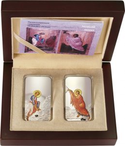 Елегантний колекційний набір, присвячений пророку Мойсею — великому законодавцю та провіднику ізраїльського народу. Мойсей шанується в юдаїзмі, християнстві та ісламі, як посередник Завіту і носій Божого закону. Його життя символізує покликання, слухняність і визволення. Сюжети монет Ліва монета: Мойсей знімає сандалі перед Неопалимою Купиною — момент божественного покликання («місце, на якому стоїш, — земля свята»). Права монета: Одкровення на Синаї — Господь у хмарі вручає пророку скрижалі Завіту з Десятьма Заповідями. Обидві композиції відтворюють іконографію, що розміщена біля південного та північного входів до каплиці Неопалимої Купини на Синаї. Вибіркове кольорове оздоблення делікатно підкреслює святі образи.