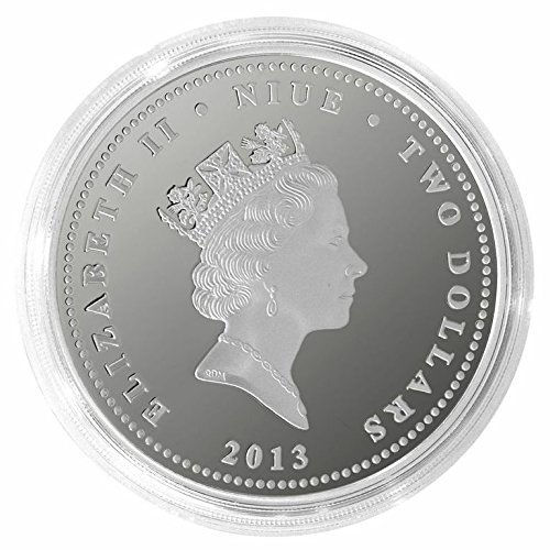 На аверсі зображено портрет Її Величності Королеви Єлизавети II, створений художником Ієном Ренком-Бродлі. Навколо по колу розміщені написи: “ELIZABETH II”, “NIUE”, “TWO DOLLARS”, а внизу – рік випуску монети “2013”. Дизайн виконано в класичному стилі, з гладким дзеркальним фоном, що контрастує з рельєфним портретом монарха.