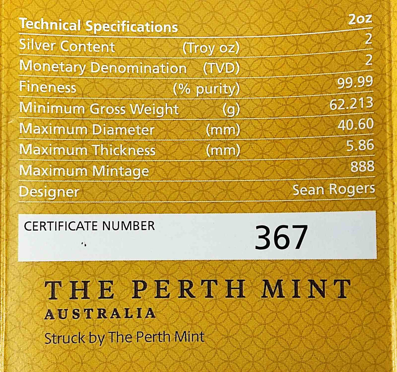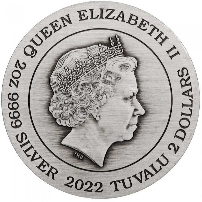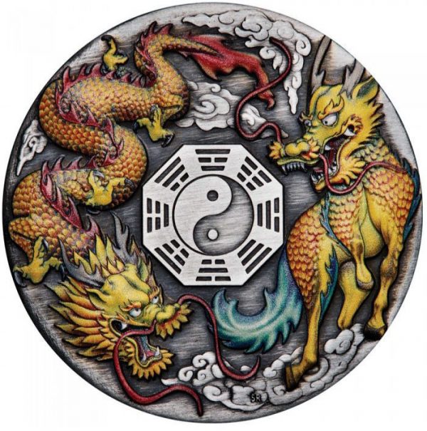 На реверсі монети зображений яскравий дракон з довгим викривленим лускатим тілом і цілінь, ніжна істота у формі коня з лускатим тілом і головою, що нагадує дракона. Легендарні звірі зображені на реверсі монети навколо символу інь-ян із античним оздобленням. На аверсі монети зображено портрет Її Величності Королеви Єлизавети II та надписи: «QUEEN ELIZABETH II» – ім’я Королеви, «2 DOLLARS» – номінал, «TUVALU» – країна-емітент, «2OZ 9999 SILVER» – вага монети та проба срібла, а також “2022” – рік випуску.
