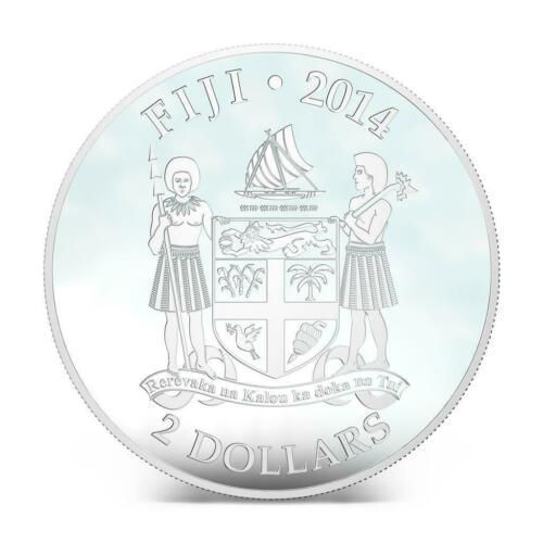 Аверс монети прикрашає герб Республіки Фіджі. У центрі розташований щит із національними символами — човен, пальма, цукрова тростина та голуб миру. Щит підтримують два воїни в традиційному одязі, а вгорі розміщений вітрильник, що символізує історію мореплавства островів. Над гербом викарбувано напис «FIJI • 2014», унизу — номінал «2 DOLLARS».