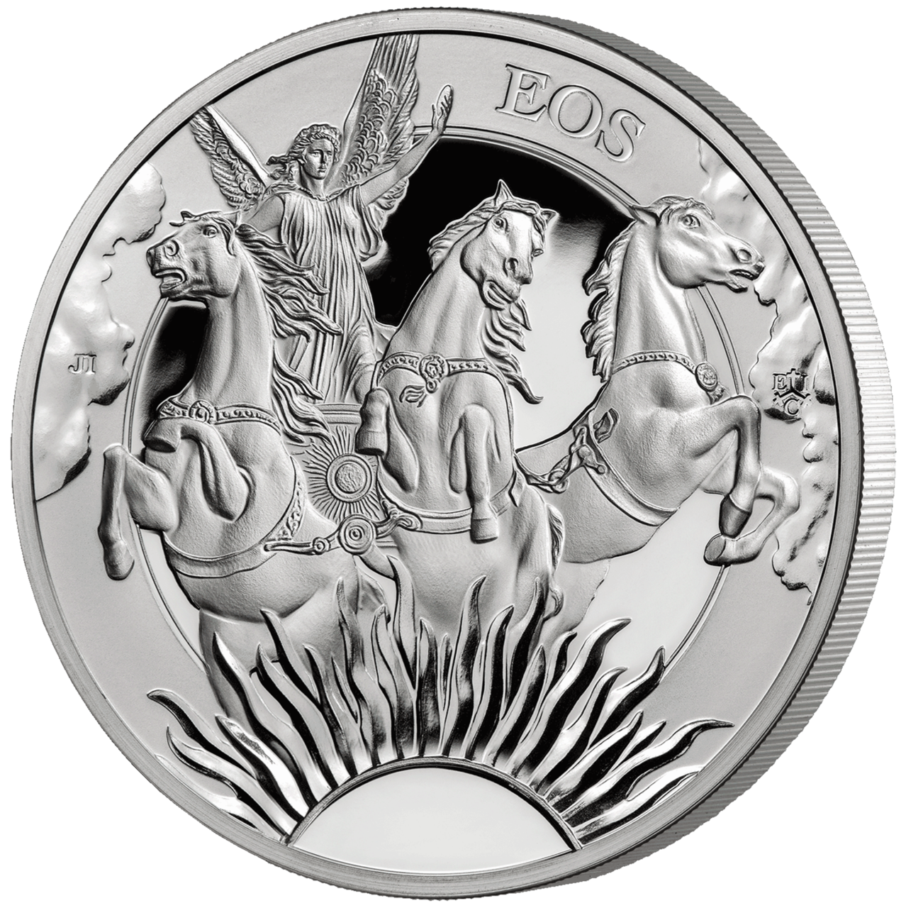 Срібна монета “Eos” присвячена давньогрецькій богині світанку, яка символізує відродження, світло та надію. Монета поєднує витонченість класичного мистецтва з сучасною точністю карбування, відтворюючи момент, коли богиня Еос з’являється на небі, відкриваючи новий день. Її зображення в упряжці коней стало метафорою життєвої енергії та початку нового циклу.