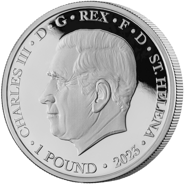 Аверс монети прикрашений портретом короля Чарльза ІІІ у профіль, виконаним у високому рельєфі з тонкими деталями. Навколо зображення розміщено написи “CHARLES III • D • G • REX • F • D • ST. HELENA”, номінал “1 POUND” і рік випуску “2023”, що засвідчує офіційний статус монети як законного платіжного засобу острова Святої Єлени.
