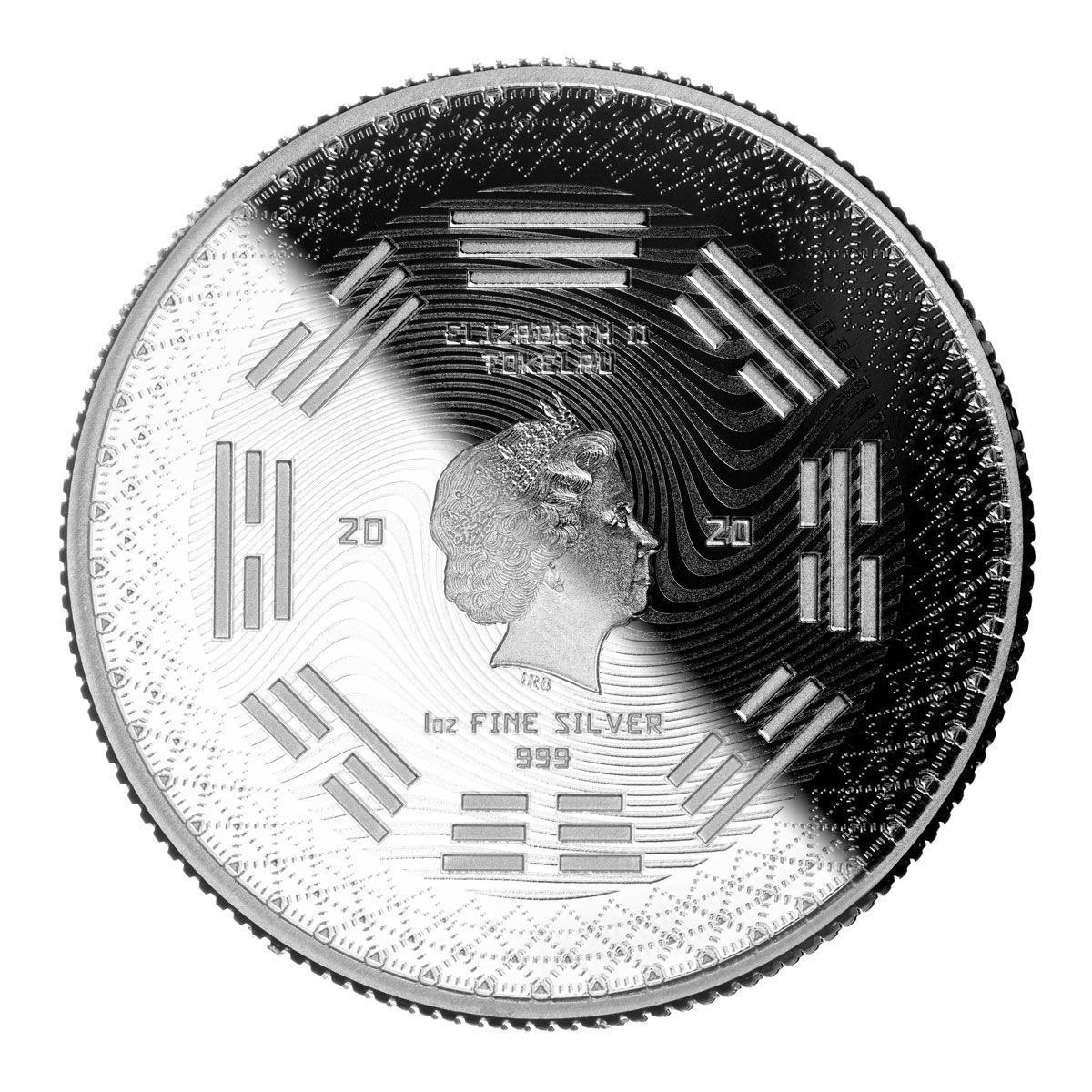 На аверсі зображено портрет Її Величності королеви Єлизавети II, оточений традиційними триграмами з китайської «Книги Змін» (І Цзин), що символізують рівновагу та циклічність світу. Під портретом розміщено написи 1 oz FINE SILVER 999, TOKELAU, а також рік випуску 2020, що підтверджують якість срібла та офіційний статус монети.