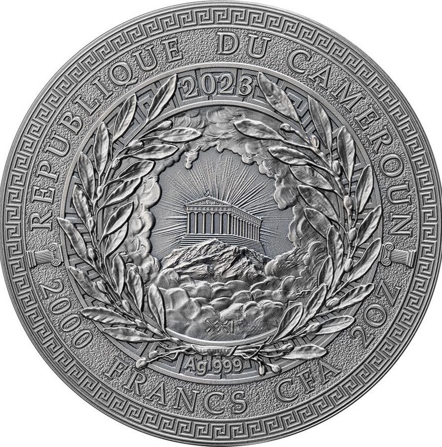 Аверс монети ідентичний всій серії: у центрі — Парфенон на Акрополі в променях сонця, обрамлений вінком з лаврових і дубових гілок. По колу розміщені написи «RÉPUBLIQUE DU CAMEROUN», «2023», номінал «2000 FRANCS CFA» та «2 OZ Ag 999». Край прикрашений класичним грецьким меандром.