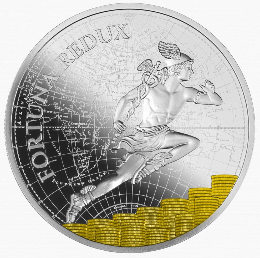 Реверс вражає динамічністю композиції. У центрі зображено Меркурія — римського бога торгівлі, швидкості та удачі, який уособлює енергію руху й прагнення до успіху. Його крилаті сандалі символізують легкість досягнення цілей, а кадуцей у руці — гармонію між ризиком і винагородою. На тлі карти світу розміщено золотисті монети, що утворюють сходи — знак зростання добробуту. Напис «FORTUNA REDUX» нагадує про повернення удачі та процвітання.