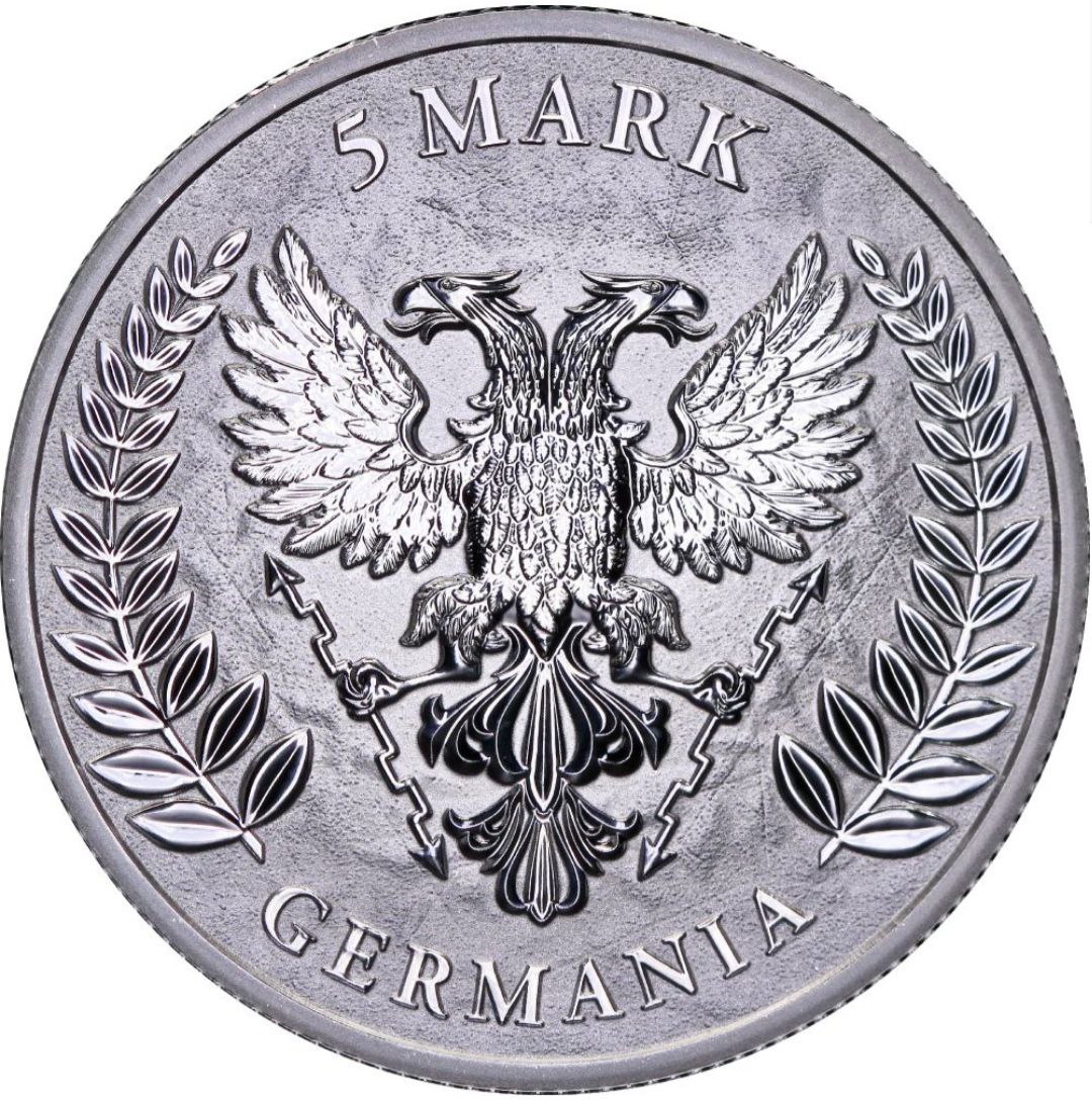 Аверс монети зображує двоголового орла — геральдичний символ Германії, що символізує єдність та рівновагу між владою і духовністю. Орел оточений вінками з дубового та лаврового листя, які уособлюють мужність і перемогу. Надпис «5 MARK» вказує на умовний номінал, що є традиційною особливістю серії, тоді як «GERMANIA» підкреслює міфічний характер випуску.