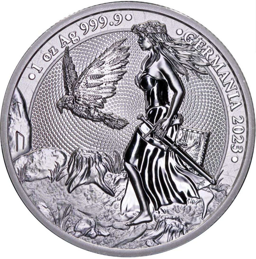 Реверс демонструє фігуру Германії — жіночого втілення нації, з мечем у руці, що впевнено крокує вперед. Біля неї летить сокіл, символ мудрості та провидіння. Фон оформлений у вигляді гравійованої структури з мікродеталізацією, що створює ілюзію глибини. Уздовж краю розміщені написи «1 oz Ag 999.9» і «GERMANIA 2023», які підтверджують вагу, чистоту металу та рік випуску.